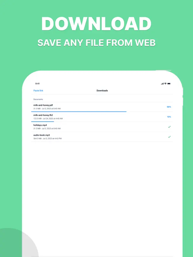 Web browser and downloader of files.● Download any files● Offline storage● Web Browser● Play audio and video files● File manager: copy, edit ● Share filesThe application allows you to browse the web, download, and manage files on your iPhone, and iPad. Preview images, documents, PDFs, and media files. Transfer files to your computer via Wi-Fi. Upload and manage your files.Download big files on the background, and manage downloaded files.FEATURES:● Private and Safe web surfing● Passcode lock● Web browser- Full-screen mode- Google search- Search auto-completion- History support- Address bar auto-completion- HTTP basic authentication● Download files- Fast speed- Control of loading: pause and resume- Speed indicator and download progress bar- Download notification● File manager- Store files offline- Preview documents with file formats: .pdf, .doc, .xls, .ppt, .txt, .html and .rtf- Create folders- Move, rename and delete files- Search by file name- Unzip ZIP files● File sharing- Transfer files to a computer via Wi-Fi- Upload files to a smartphone via Wi-Fi- Share files with any application (email, Files app)● Multitasking- Background downloading● Play video: mp4, mov, avi, mpeg and other formats.● Play audio- You can play any audio fileNOTE: the app does not download audio and video from unauthorized websites.In-app purchase: "Full access: unlock features" provides full access to the app without ads. The app would be able to transfer files over Wi-Fi.• Length of subscription is 1 month.• Payment will be charged to iTunes Account at confirmation of purchase• Subscription automatically renews unless auto-renew is turned off at least 24-hours before the end of the current period• The account will be charged for renewal within 24-hours prior to the end of the current period, and identify the cost of the renewal• Subscriptions may be managed by the user and auto-renewal may be turned off by going to the user's Account Settings after purchase• Any unused portion of a free trial period, if offered, will be forfeited when the user purchases a subscription to that publication, where applicableTerms and conditionshttp://bit.ly/2DRI1GVPrivacy policyhttp://bit.ly/2PQmyCJ
