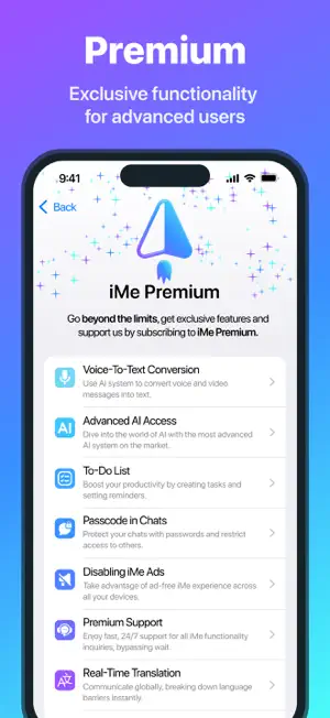 2024-04-12 iMe Premium subscription launch: - Voice2Text Conversion - Premium App Icons - Premium Support - Real-Time Translation - Cross-Platform Synchronization - x2 Connected Accounts - Disabling iMe Ads - Premium Profile Mark - Stories Displaying Settings - Passcode in Chats - Messages Filter 10.9.1
