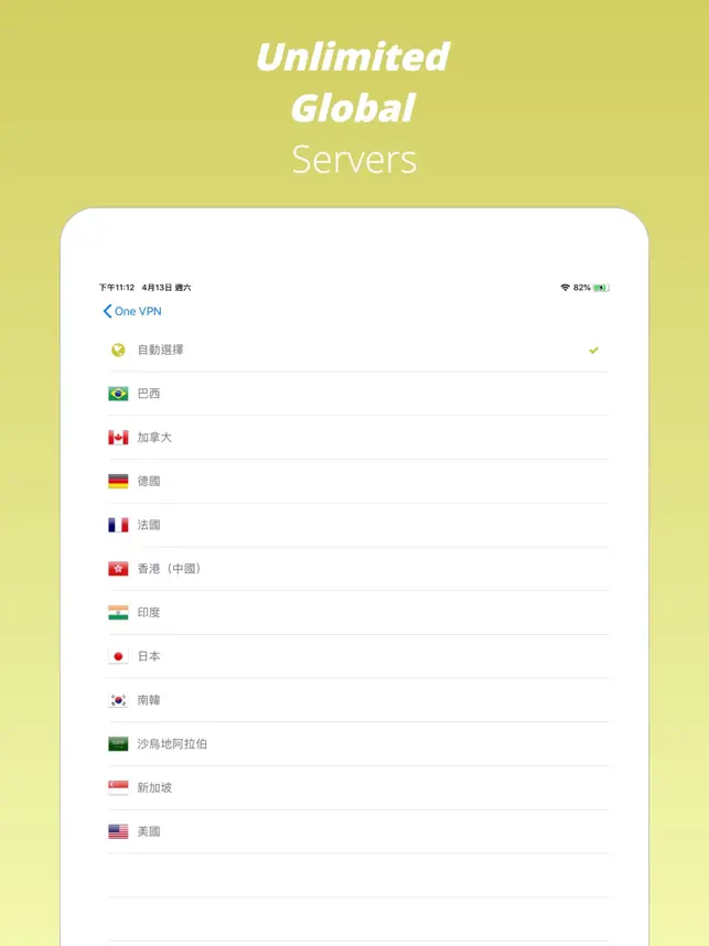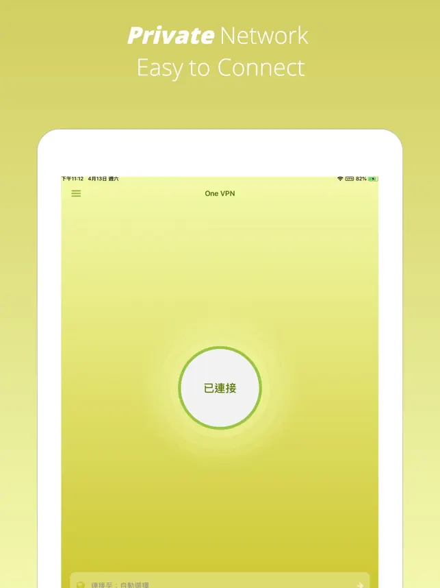 * One VPN: Limitless & OneTouch & Easy to Connect OneVPNOpen VPN Client. Unlimited, No bandwidth limitation. Well designed: One touch to connect to Open VPN server * One VPN: Privacy Guard & Secured Connection & AnonymousAll traffic is encrypted by One VPN to protect privacy. Nothing about your online behavior would be tracked. Secure the connection under any WiFi hotspot to provide anonymous browsing. * One VPN: Fast & Stable ConnectionDynamically adjusted server list to ensure best servers provided. Always provide the server with high speed.Provided servers cover U.S, Germany, Japan, Korean, Canada, etc. Provide service with OpenVPN protocol** Note ** We DON'T collect any data with VPN function