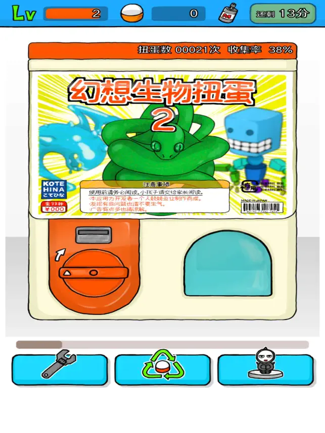 集齐扭蛋!多转转扭蛋机,集齐全部道具吧!!扭蛋里放的是小孩子课本角落的涂鸦一般的神奇生物无论你是小孩子还是成年人,你都能从无限扭蛋中得到乐趣。将得到的道具摆在架子上展览吧!扭蛋里的道具都是看也看不懂的怪异玩意儿,或者让人忍不住想收集的奇妙物体。出现什么全看运气!多玩玩扭蛋吧!在出门堵车时,宿醉不起时,午休无人陪伴时,请玩这个游戏打发时间。孩子闹别扭时说不定也有用!不断追加全新扭蛋机!・超多的奇妙幻想生物「幻想生物扭蛋」・这样的寿司你绝对没见过……「寿司扭蛋」・进化即浪漫!「超进化扭蛋」・收集3个连起来「合体扭蛋」・有谁不喜欢套娃呢!「套娃扭蛋」・帅气极了的「龙扭蛋」追加放置养成游戏!!神奇生物突然出现。它的主食是扭蛋的壳。扭蛋的壳,扔了好像也很浪费嘛。那就用来养鱼神奇生物吧!【玩法】玩扭蛋机就会得到扭蛋的壳。将扭蛋壳给神奇生物吃。神奇生物想吃就会吃。玩扭蛋时它会吃,可是关闭应用时就不会吃了。不要着急,慢慢享受放置养成游戏的乐趣吧。【联系我们】游戏过程中如遇到任何bug或者建议都可联系我们提出新浪微博:@扑家工作室微信公众号:搜索“扑家工作室”添加QQ讨论群:627088815