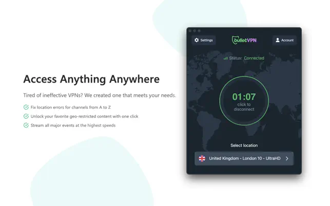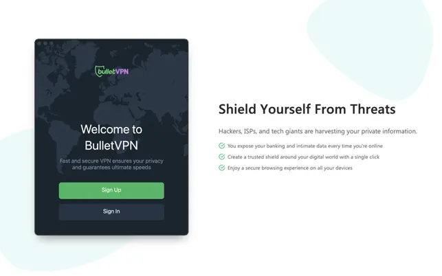Our revamped MacOS app is finally here. We developed the new application in-house to improve security and efficiency, with bug fixes and an easy-to-use interface. Take complete control of your internet with BulletVPN, designed to bring you a safer and better Internet. 30-day money-back guarantee.Improved Interface & DesignWe took things from smooth to smoother with our newly-designed app, which is even easier to use now.• Brand new codebase from scratch for better efficiency and speed• Improved design• Server categories and filters• Dark and Light app themesGrade-A Security & PrivacyProtect your personal data from hackers, ISPs, and every other eavesdropper with top-of-the-line security.• Military-grade AES 256-bit encryption.• Strict zero-logs policy• Wireguard, BulletSpeed TCP, BulletSpeed UDP, IPSec, and IKEv2 VPN protocols• IP check tool• DNS, IP, and WebRTC leak protectionGlobal Internet AccessConnect to our reliable, global server network and enjoy a new online world.• Server locations in 55+ countries (and growing)• P2P supportWide Device SupportInstall or set up the BulletVPN app on your favorite device and get online privacy and freedom wherever you go.• 6 simultaneous connections with unlimited device switching5-Star Customer ServiceGot questions? Contact our expert customer support team at any time, and you'll be up and running in a jiffy.• 24/7 email, ticket, and live chat support• Easy setup guides• Help center and FAQs• Better customer support features30-Day Money-Back GuaranteeTry BulletVPN risk-free for 30 days. Get your money back if you're not satisfied.Terms of Use: https://www.bulletvpn.com/bulletvpn-terms-of-use/Privacy Policy: https://www.bulletvpn.com/bulletvpn-privacy-policy/