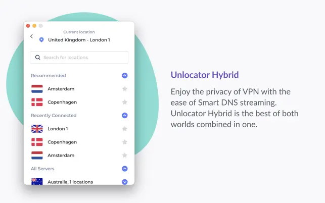Unlocator VPN is secure, private, fast and easy to use VPN for your Mac. Enjoy unlimited access to our world class VPN network. ►INSTANT PRIVACYWith Unlocator it takes just one click to protect your privacy. ►BANK LEVEL SECURITYWe use bank level encryption on your data connection to protect you from bad guys. - 24/7 Friendly Support- Blazing Fast- Unlimited Bandwidth- Bank-Level Encryption- Instant Wifi Protection- Connect 5 Devices at Once- Single Click Connection- Auto Reconnect- Connect on Start up- World Wide Servers►UNLOCATOR VPN SUBSCRIPTIONS• We provide 3 VPN subscription lengths: 1, 6 and 12 months. Each subscription gives you access to our world wide VPN and Smart DNS network• Payment will be charged to Apple Account at confirmation of purchase• Subscription automatically renews unless auto-renew is turned off at least 24-hours before the end of the current period• Account will be charged for renewal within 24-hours prior to the end of the current period, and identify the cost of the renewal• Subscriptions may be managed by the user and auto-renewal may be turned off by going to the user's Account Settings after purchasehttps://unlocator.com/privacy-policy/https://unlocator.com/terms-of-use/